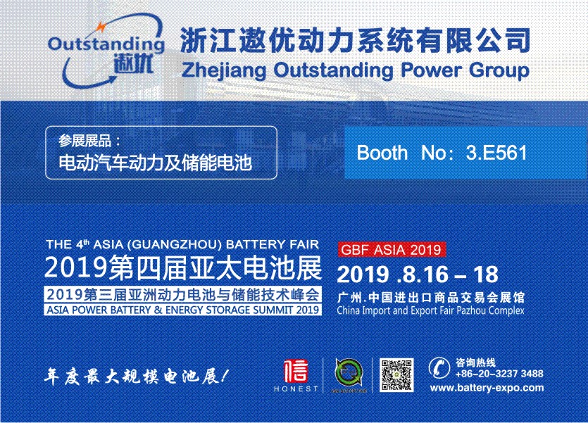 浙江遨优动力系统有限公司以144平米超大展位重磅出席2019年8月16-18日在广州.广交会展馆A区举办的GBF.ASIA 2019第四届亚太电池展!