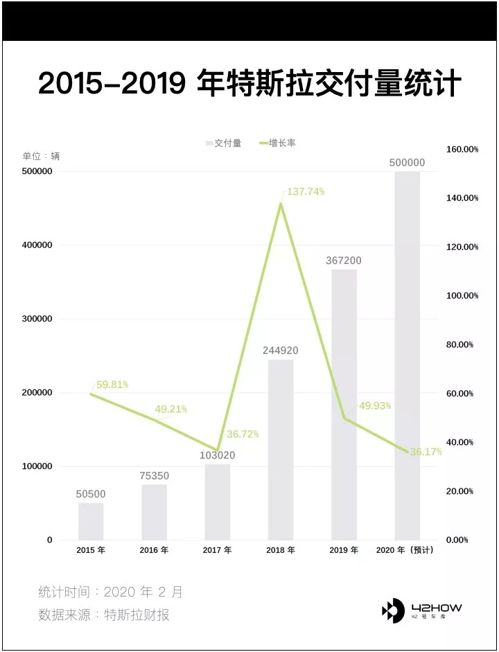 先简单回顾一下特斯拉历年的交付量以及增长率。