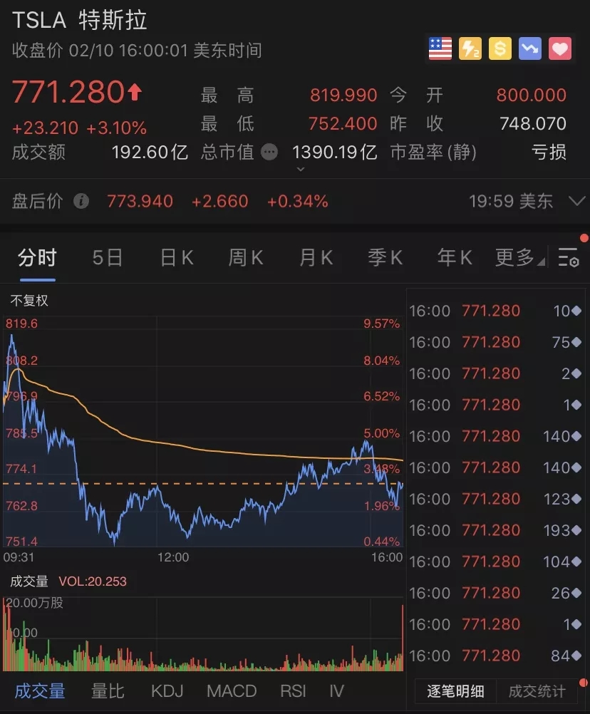 2020 年 2 月 10 日特斯拉上海工厂正式恢复生产,晚间开盘之后特斯拉股价又暴涨近 10%。
