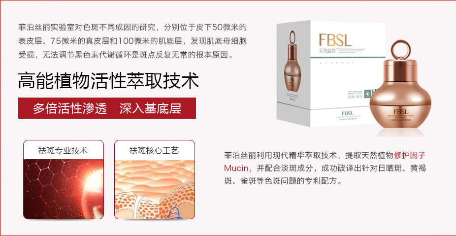菲泊丝丽是由多种草本植物精华萃取而成,纯净天然,能有效修复受损基底母细胞、保湿锁水抗氧化,促进细胞新陈代谢从而激活细胞活性,加速黑色素的分解与排泄,从而减少皮肤色素沉积,彻底祛斑不反复。看似浓厚的霜状质地,吸收却非常快,而且延展性极好,抹在肌肤上丝毫没有沉重的感觉。