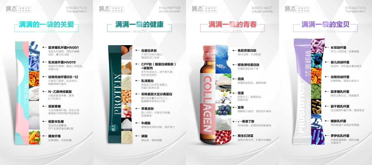 姵态是好普集团旗下的明星自主品牌,定位为“高端美学营养品牌”,宗旨为“快乐变美,轻松赚钱”,专注于为女性打造高端、健康、营养、美好、时尚的生活,被微商教父龚文祥誉为“益生菌新零售第一品牌”!产品主要有全年龄段各款益生菌、燕窝胶原蛋白肽、多肽蛋白质粉等功能美学营养品。