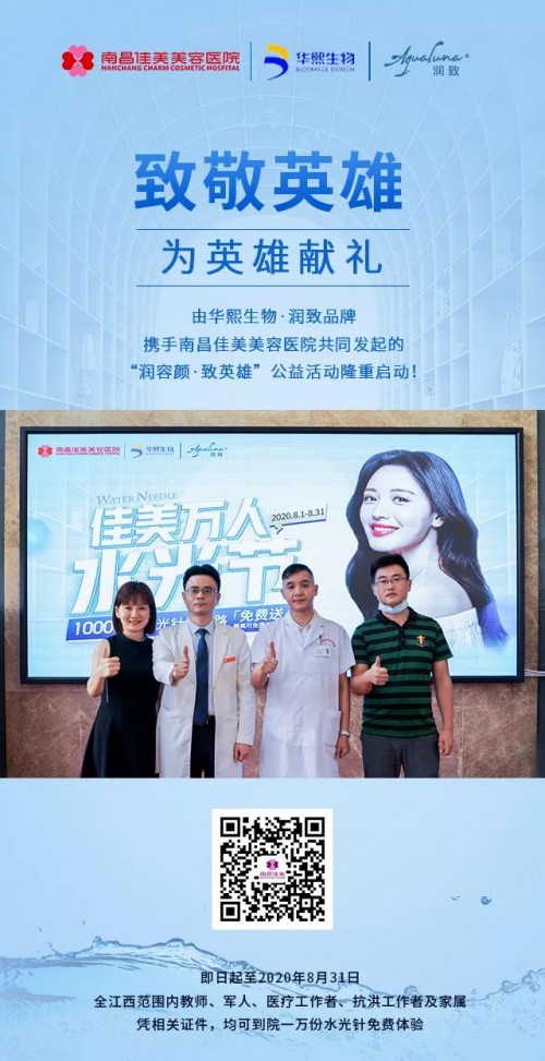 在此次公益活动中,凡是教师、军人、医疗工作者、抗洪工作者及家属均可凭有效证件享受到免费水光针注射,更有多重好礼感恩相送,这是南昌佳美为江西英雄们献上的小小心意。在这场没有硝烟的战斗中,我们知道,我们能做的很少,惟愿江河安澜,无病无灾,希望这份蜕变之礼,能让英雄们靥开笑颜,感恩你们的努力让江西美丽如初。