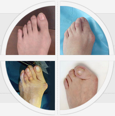 多数人会出现大拇趾偏斜超过25°角,正面看脚都是歪的,拇囊炎严重,脚上出现厚厚老茧、鸡眼,有的二趾和大拇趾重叠,有的五个脚趾并列往外偏,脚掌比之前宽0.8-1.5㎝,买鞋不方便、走路脚痛。