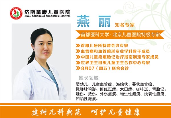 济南童康儿童医院,是经上级卫生部门批准,在残联、民政、儿研所等部门,以及首都医科大学北京儿童医院、上海儿童医院等多家国内三甲医院的专家的支持下,成立的一所集医疗、保健、康复、科研、健康宣教为一体的儿童特色专科医院。济南童康儿童医院皮肤科主要治疗婴幼儿血管瘤(草莓状血管瘤、海绵状血管瘤、混合血管瘤、淋巴管瘤、血管畸形等)、疤痕(疤痕疙瘩、增生性疤痕、凹陷疤痕、烧烫伤疤痕、挛缩性疤痕等)、胎记(鲜红斑痣、青胎记、太田痣、咖啡斑、雀斑等)等皮肤疾病。
