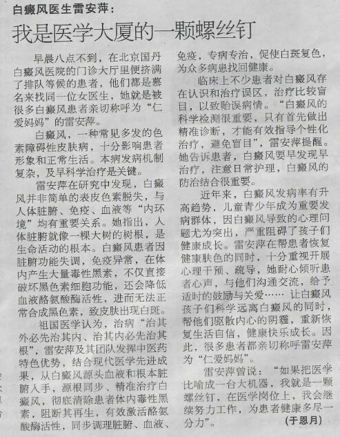 由人民日报社主办的《健康时报》以《白癜风医生雷安萍:我是医学大厦的一颗螺丝钉》为题,对雷安萍的医学事迹和螺丝钉精神进行了报道。