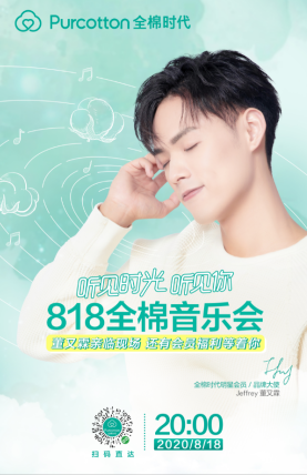 Jeffrey董又霖作为全棉时代品牌大使,将亲临818音乐会现场,带来主题曲《棉》的线下首唱,并于全棉时代直播间与粉丝互动畅聊,发放惊喜福利。