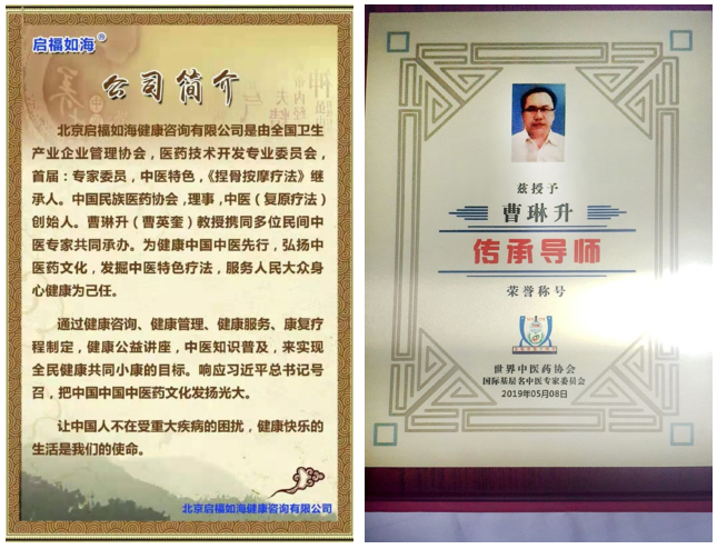 学道须当猛烈,始终确守初心。曹琳升出生于医学世家,是至今为止惟一的祖传特色捏骨复原疗法继承人,他从医三十年余,从小耳濡目染,对中医包含深厚感情。他深知祖传特色捏骨复原疗法能够保存至今十分不易,经过了家族几代人代代相传,集生理、心理、健康于一体,以“肺主皮毛,脾主肌肉,肾主骨,肝主经,心主血脉”为理论基础,通过病人外在气血判断其五脏六腑功能失衡状态,传承中医“望闻问切”,达到科学问诊,绿色治疗,使病人尽早恢复健康水平。然而受西医冲击,中医学发展一直举步维艰。2013 年,首届中国药学知识传播创新发展研讨会顺利召开,此次会议让曹琳升明白国家开始逐渐注重中医传统文化,他明白这是中医发展的大好时机,而中医对于中国发展更是不可或缺的一环。他立即响应国家号召,担负中医人的社会责任感,励志要弘扬中医传统文化,服务人民大众身心健康,改善中国人民健康状态,经过数次与多个中医学术专家研讨,最终与全国卫生产业企业管理协会、医药技术开发专业委员会携手在北京成立启福如海健康咨询有限公司公司。