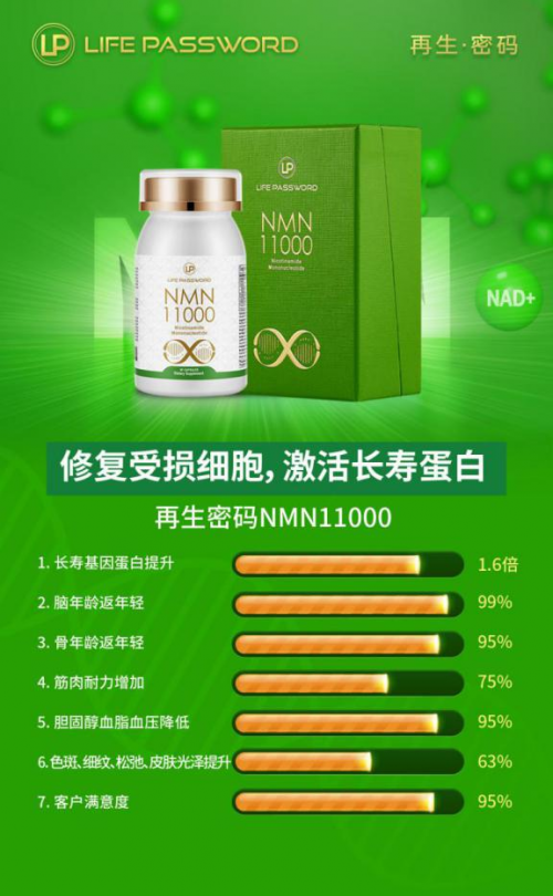 受到社会精英圈层热捧的再生密码NMN11000,是由LIFE PASSWORD美国科研团队,通过生物酶催化技术成功研制出高活性、高纯度新一代NMN产品。它以β-NMN(只有该类型NMN成分才具有生物活性)为主要原料,采用肠溶植物胶囊,可在胃酸下稳定存在,胶囊到达小肠后能够快速被人体吸收,30分钟内即可穿透细胞壁直接到达线粒体,快速激活长寿蛋白Sirtuins1-7、修复细胞DNA、增强机体免疫力、减缓细胞衰老,从内而外重返年轻状态。