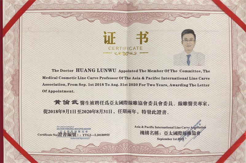 2018年,黄伦武主任受邀参加亚太国际线雕协会举办的学术大会,会上就线雕技术新理念、新技术展开激烈谈论,重点以面部年轻化抗衰、再生线性材料及综合年轻化体系等新理论、临床技能应用交流为主题探讨,分享微整、手术操作演示教学。另外,黄伦武还被聘请为“亚太国际线雕协会委员会委员”,实力荣膺!