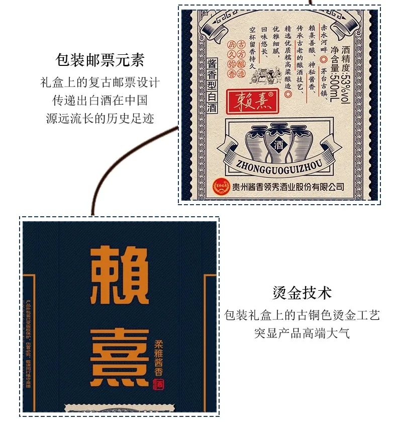赖熹采用陶坛长期贮存,以此利于低沸点物质的挥发和酱香酒特有陈香的形成。其酒味丰满醇厚、幽雅细腻、回味悠久、空杯留香。具有香气香而不艳、低而不淡、醇香幽雅、不浓不猛、回味悠长等特点,包装简约大气,不但是自饮佳品,也是礼尚往来馈赠亲友的最佳选择。
