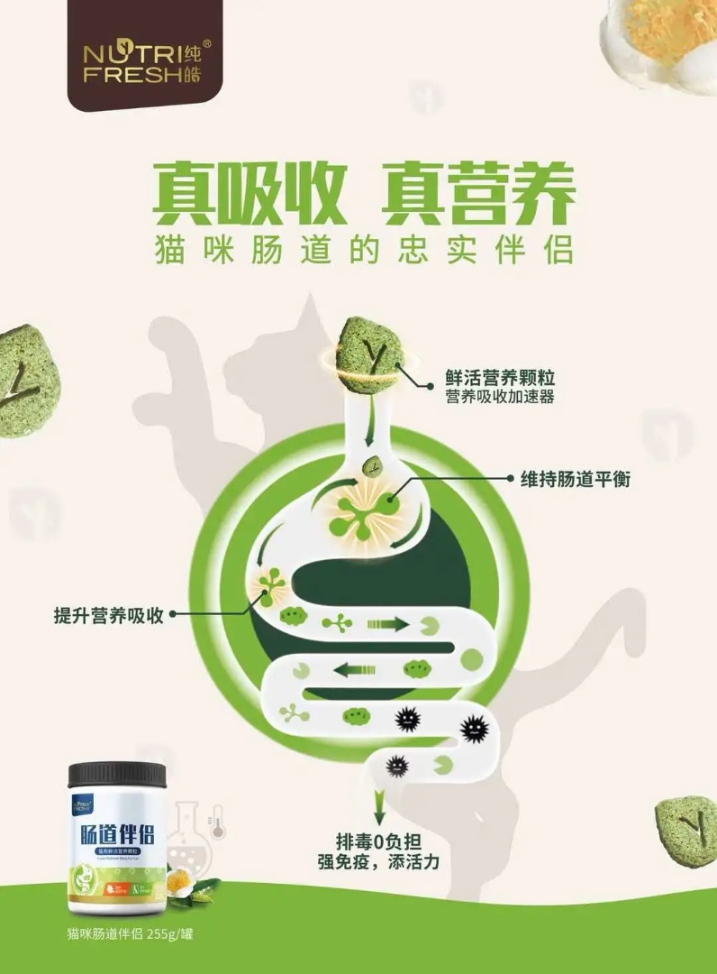 纯皓肠道伴侣宠物零食猫用鲜活营养颗粒:小分子肽促进营养吸收, 茶多酚抗氧化,强免疫,有益活性酶,促进排毒,让肠道有无负担。