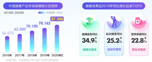 2020年全国大健康产业市场规模预计将达8.7万亿元。健康服务、运动健身和营养保健成2019年增速最快的三大品类。"预防大于治疗"成为健康消费新主张,国民开始追求更加健康的生活方式,花式保健全面开启。