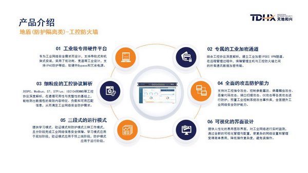 天地和兴工控防火墙采用工业级的专用硬件平台,支持DIN导轨式和机架式安装,采用了低功耗、宽温等工业设计,支持IP40防护等级;拥有全面的攻击防护能力,具有自学习白名单、全适应IPV6、与平台类设备联动等一系列功能,完全符合《GB/T 37933——2019信息安全技术 工业控制系统专用防火墙技术要求》标准要求。天地和兴工控防火墙现已广泛应用于电力、轨道交通、钢铁冶金、石油石化、智能制造等工业领域,时刻保障国家关键信息基础设施安全运行。