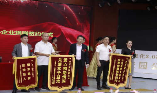 深圳市融智联科技有限公司、深圳市海和科技股份有限公司、瑞丽市谊灵草农业发展有限公司、广东泓钊教育科技有限公司四家爱心企业分别向智慧校园基金捐赠了一批价值900多万元的智能考勤设备、教育安全教学平台、教育心理测评系统、健康杀菌设备,智慧校园物质。
