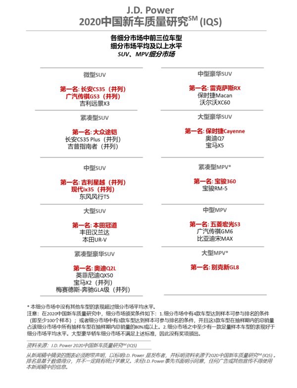 J.D. Power 2020中国新车质量研究(IQS)SUV、MPV细分市场前三名车型
