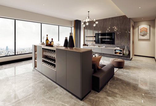 2020年匠心推出了一系列高端集成家居新品。现代简约风格力作礼居Ⅱ,以极简的形式呈现整体风格,灰色烤漆面板化奢入俭,为全屋营造高级感。采用嵌入式隐形拉手工艺,外观更简洁,带来简单而平和的生活方式。在优雅的餐厅空间内,餐边柜采用一柜多用的设计,承担了酒柜和隔断柜的双角色,既是客厅与餐厅的边界,也是一家人情感交流的桥梁。
