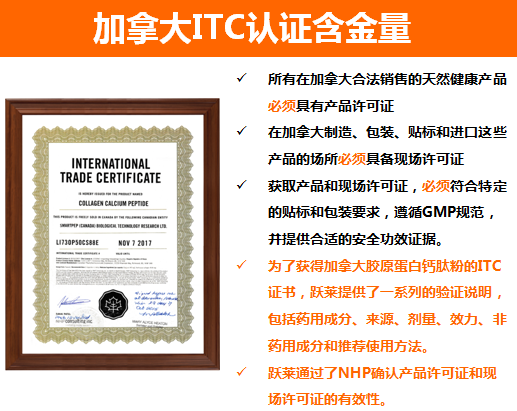 跃莱公司的胶原蛋白钙肽粉获得了由代表着加拿大卫生部的NHP(NaturalHealth Products)部门颁发ITC(InternationalTradeCertificate)证书,批准了胶原蛋白钙肽粉产品可由SMARTPEP(加拿大)生物科技研究有限公司在加拿大自由销售。意味着跃莱产品正式进入国际市场,并拥有国际官方认证。