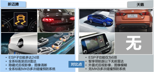 新迈腾拥有多项高科技品质,在B级车中拥有很大优势,在外形配置方面有LED大灯LED流水转向灯,感应式电动尾门,10.3英寸液晶仪表盘,和手机无线充电等等。而天籁的配置跟a级车差不多,同时内饰所用硬塑料很多,没有豪华感,更没有科技感。新迈腾的主动安全防护非常全面,全系标配24项子功能的ESP和MKB多次碰撞预防系统,而天籁的ESP仅有6项,无MKB,防护不全面;并且新迈腾全系标配后视影像,而且后视影像画面清晰,警示效果更好,而天籁后视影像很模糊,影响泊车安全;新迈腾全系标配8个雷达,全方位防护,泊车更安心,而天籁主销车型无前雷达,这么大的车,泊车提醒比较差。