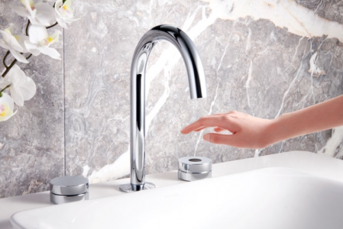 科勒艺廷三孔感应脸盆龙头: 与传统款一致的经典造型,灵敏免触感应,预设温度流量,自由控制水流时长。