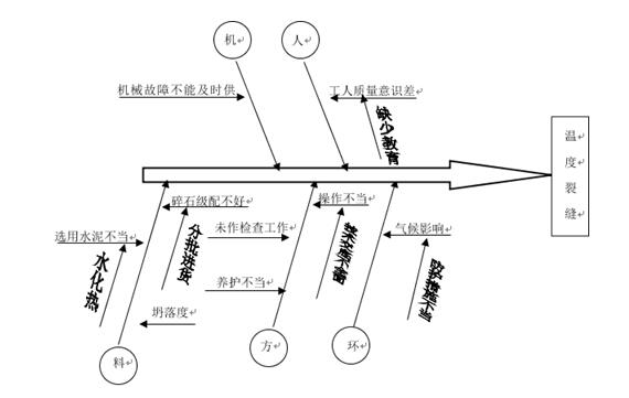 温度裂缝的走向通常无一定规律,裂缝宽度大小不一,受温度变化影响较为明显,冬季较宽,夏季较窄。高温膨胀引起的混凝土温度裂缝是通常中间粗两端细,而冷缩裂缝的粗细变化不太明显。此种裂缝的出现会引起钢筋的锈蚀,混凝土的碳化,降低混凝土的抗冻融、抗疲劳及抗渗能力等。