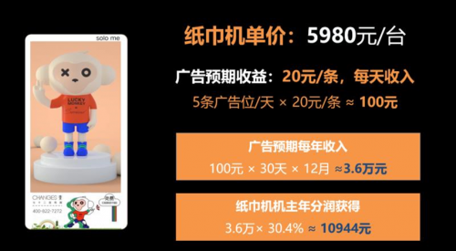 一台嗦啦咪(solome)共享纸巾机仅需要5980元,购买后即为屏主,每天所产生的收益30%是投资的这个屏主所有,每天结帐,天天收钱。也就是说,只需要5980元的入门资金,无需通过拉人头而赚取利益,投资收益率高,在家里就能收到24小时工作的嗦啦咪(solome)共享纸巾机带给你的收入。
