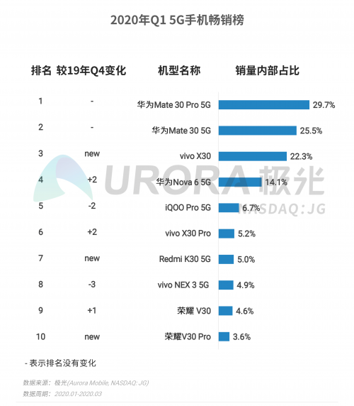 而在极光大数据发布的2020年第一季度5G手机畅销榜中,前十的机型中有4款5G产品属于vivo,几乎与华为旗鼓相当。vivo X30系列等机型都赢得了消费者的青睐和认可,获得了非常不错的销量。