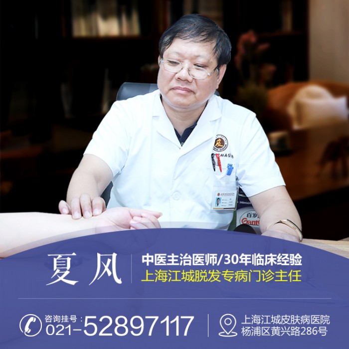 夏风,中医主治医师,上海江城皮肤病医院脱发专病门诊任,国务院特殊津贴专家顾昌林皮肤病科研团队骨干成员之一,从事皮肤病临床诊断与治疗工作30余年,诊疗经验丰富,方案独到。 擅长根据中医理论与临床经验,辨证施治,包括诊治银屑病、白癜风等皮肤科疑难杂症及脱发(普秃、斑秃、脂溢性脱发等)、荨麻疹、湿疹、皮炎、鱼鳞病等皮肤科常见病。