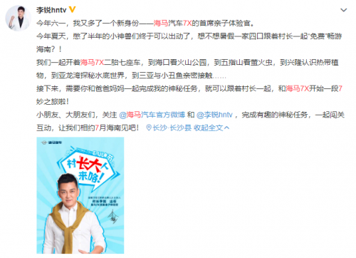 六一的时候,我在微博上搜索六一带娃怎么玩,经过数次关键词更迭后,来到了《爸爸去哪儿》主持人村长李锐的微博,发现其官宣了海马7X的首席亲子体验官身份,这不免让我对海马7X十分好奇,它是怎样收获“女儿奴”+“汽车玩家”村长李锐的信任?