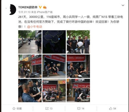 “LIFE IS A CRAZY RIDE”,环游中国的小牛用户用自己的行为诠释了这一句话,他是小牛电动有史以来,第一位骑行绕中国261天的人,30530KM,一台小牛电动车,小牛电动陪伴牛油近一年的时间,骑行结束,全车状况良好。