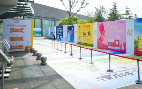 在酒店入口,以及内部进入会场必须经过的三叉路口,悦而品牌的巨幅三面广告傲然挺立,在熙熙攘攘的参会人群中显得颇为抢眼。