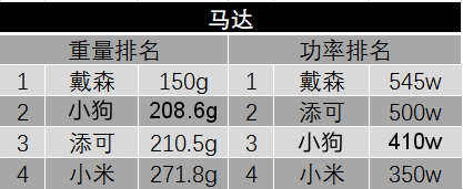 马达是一个吸尘器的核心,且市面上大部分的马达都用铁包裹这样的材质,时间久了总会产生氧化从而影响吸尘器的使用寿命。只有戴森采用的酚醛树脂,可以杜绝氧化、生锈的情况。从上表数据中可以看到,戴森是里面最轻且功率最高的。