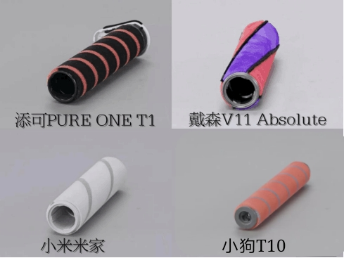 小狗采用的是软植绒的材质,在颜色上有一个区分;添可和小米米家只做了一个软硬度的区分;戴森则是采用了四条碳纤维刷头加植绒的材质,吸尘的时候会产生静电,碳纤维材质的刷条可以防止静电的产生,让灰尘被吸入尘桶中而不会被刷头缠绕。