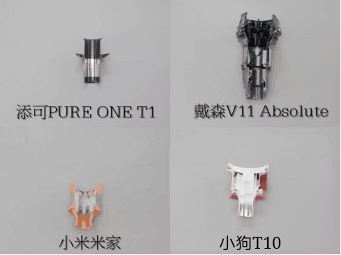 小狗采用下窄上宽的处理,是简单的气旋结构;小米的米家有九个气旋装置组合;戴森则有非常大的气旋结构,下窄上宽,中间4个,外圈10个小的锥形气旋,侧面还有很多导风孔设计;添可的造型看起来就像是望远镜,但起不到什么气旋作用。