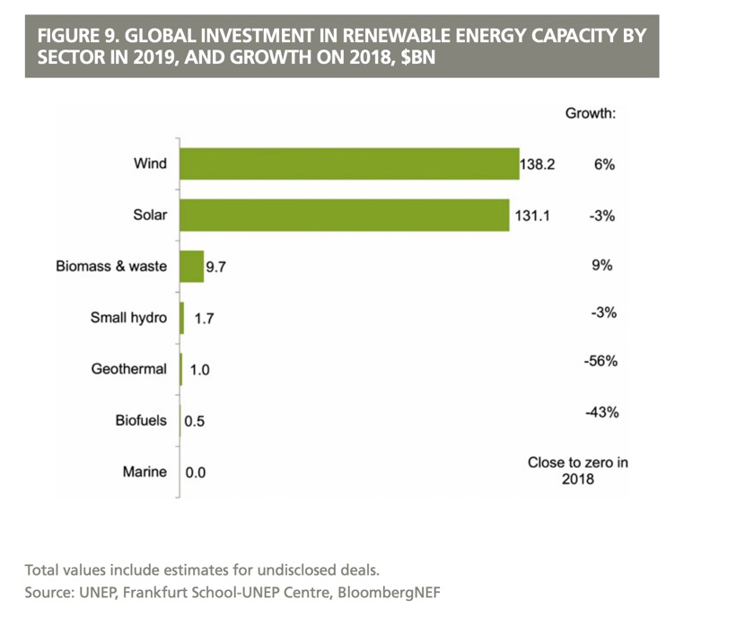 报告称,2019年可再生能源投资趋势因行业和地区而异。其中,风能吸引了1382亿美元的投资,增长6%;太阳能投资下降3%,为1311亿美元;生物质能投资增长了9%,达到97亿美元。中国的可再生能源投资下降8%,至834亿美元。