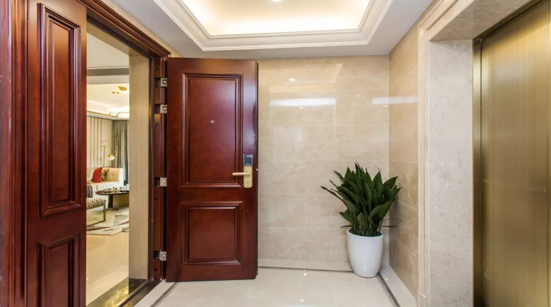 虽然是一梯两户,但是双开门电梯设计,相当于独立入户,入户门是近2米的子母门,品质感更高,私密性更强。