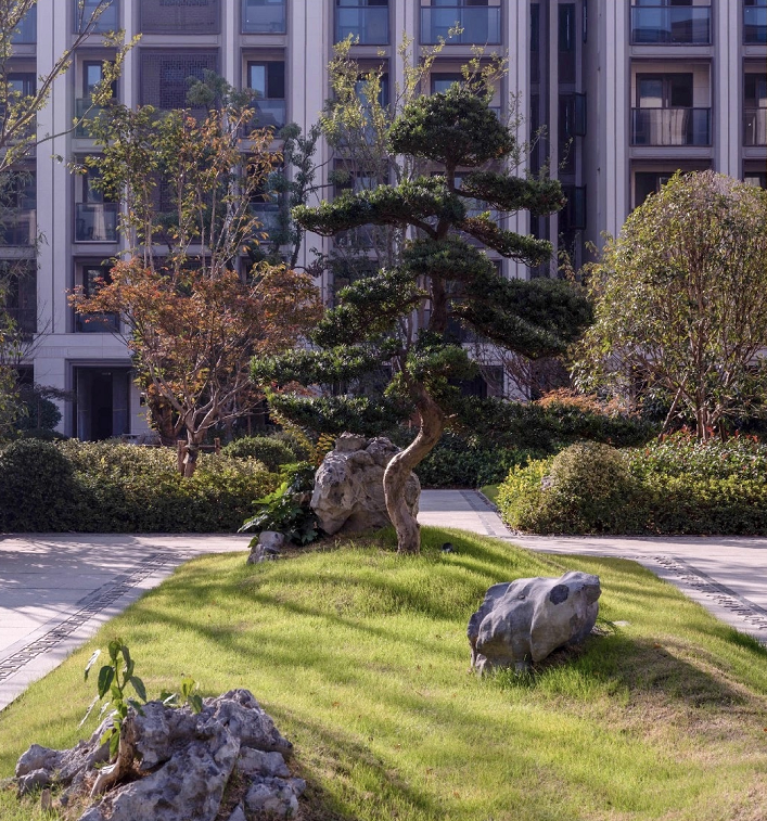 从外到里,有太多细节足够打动你。楼盘打造有近5000㎡的中式园林——新瞻园,由一班知名老匠人亲手打造,光是太湖石就引进有1800吨,全部是绿城花巨资买入,很可能随意抬眼看见的一棵黑松,就价值20万元左右。