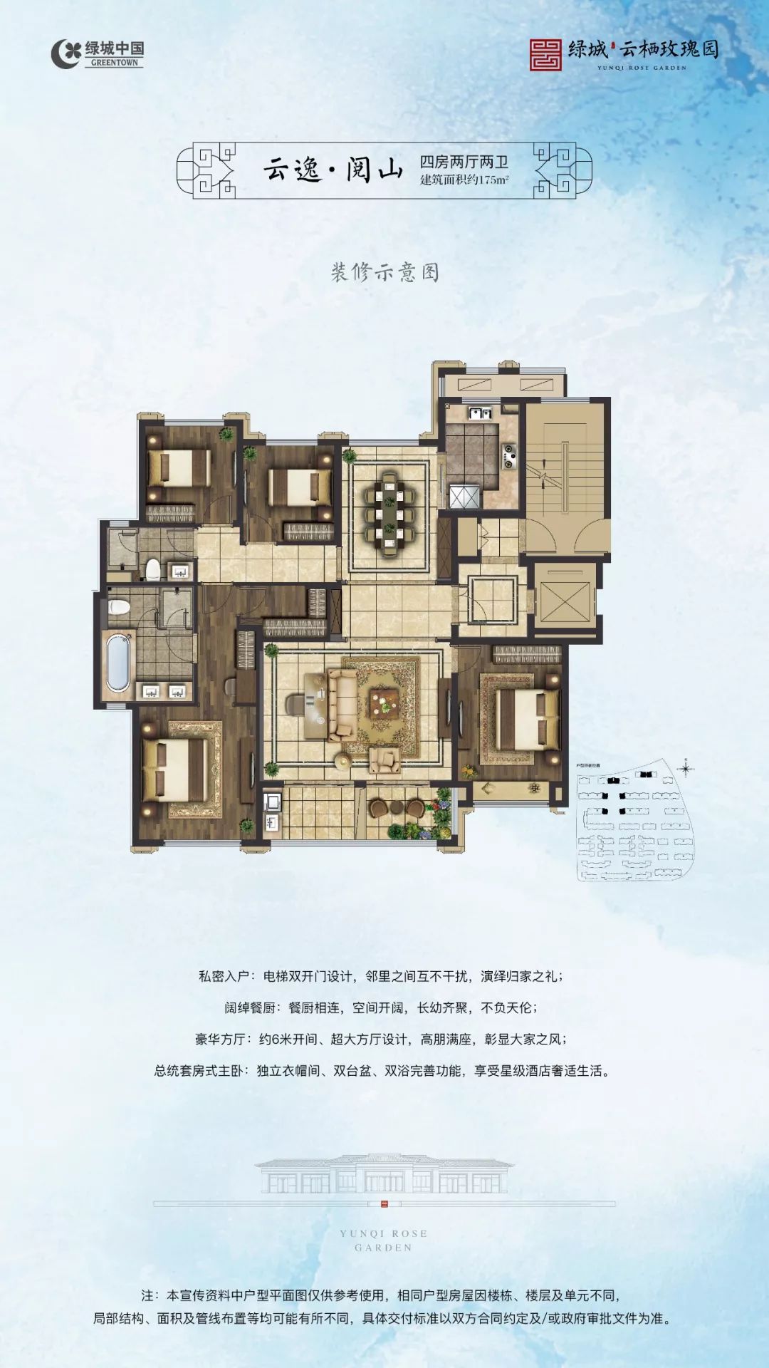 洋房产品得房率很高,也因此催生了神户型。绿城云栖玫瑰园的所有户型主卧都是套间设计。108㎡就做到了南北双阳台,空间通透明亮,完全不用担心采光。175㎡户型面宽有6.9米,阳台更是做到了2米宽景,尺度感非常强,建议现场参观实体样板间。