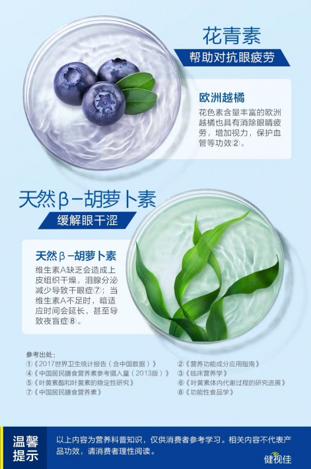 健视佳中的β-胡萝卜素,从澳洲粉红湖的杜氏海藻当中提取而来,是维生素A的安全来源,能够促进视紫红质的再生,提高眼睛的光敏度,还有助于缓解眼睛干涩的情况。拥有三种眼部营养加持的汤臣倍健健视佳,能够更好地补充学生们需要的营养物质,是一个不错的营养来源。