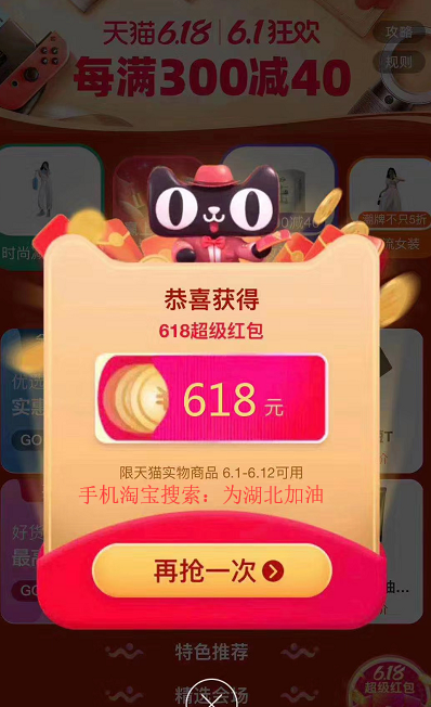 手机淘宝搜索“为湖北加油”每天领取3次618红包福利!也可以分享给好友们哦!