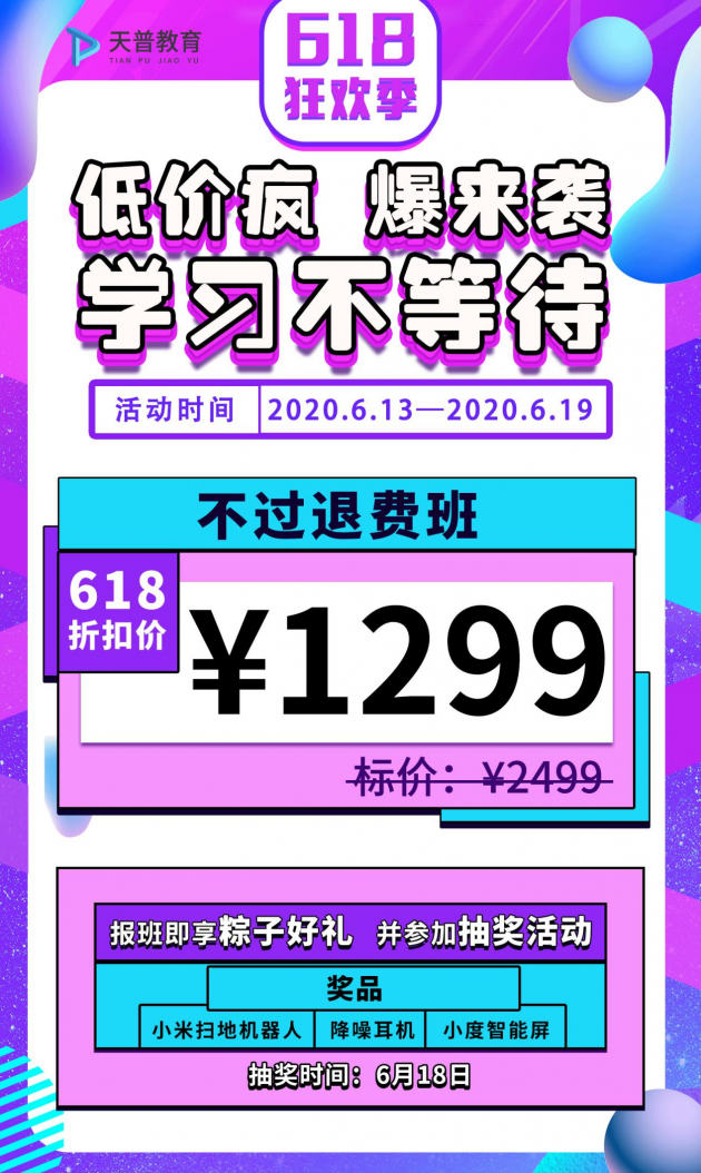 对于线上职业培训机构而言,用户的需求不仅仅是通过考试拿到某个证书,更是通过学习掌握新的职业技能,提升自己的职业竞争力,获得更广阔的发展空间。当下,新一代的职场青年,早已不能止步于一份简单机械的工作,更多人想要成为拥有多元技能的斜杠青年。与其争夺流量,天普教育更希望能以课程的高质量赢得学员的信任,用教育带给学员真切的技能提升。在6月13日至6月19日的“低价疯,爆来袭”活动中,天普教育为新一代职场青年带来了一系列优质课程多层次班型的巨额折扣。