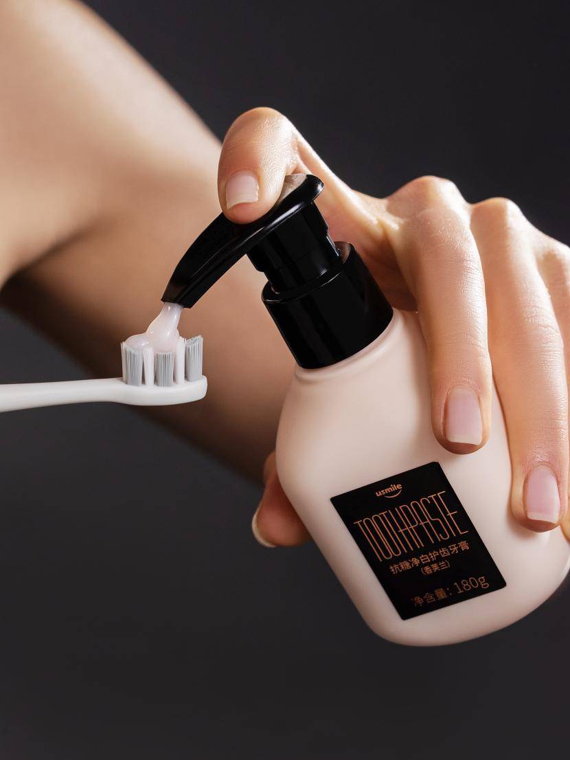 笔者洞察到,为了让消费者更好地理解产品逻辑,usmile将护肤品的动作,也融入到口腔产品当中。例如usmile成人抗糖牙膏,不仅重现了美妆动作记忆,高颜值而直立的瓶身一方面满足了“浴室美学”这个小资属性,切实提升产品为用户带来的幸福感。另一方面,对比传统的牙膏,泵压式的牙膏也更卫生,不容易滋生细菌。