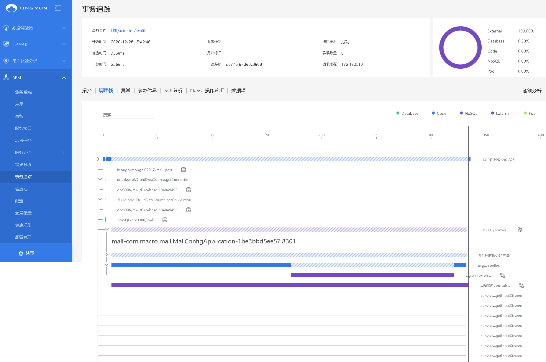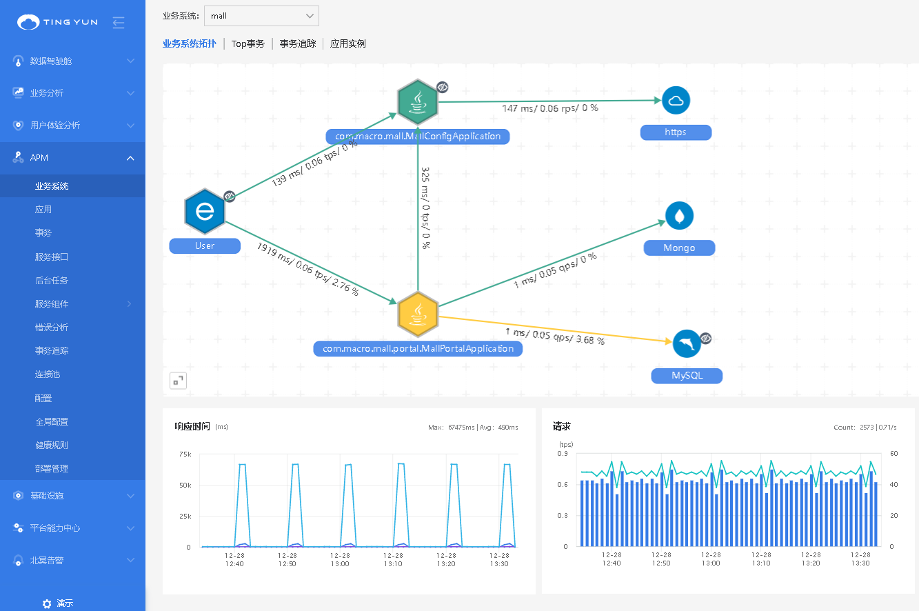 当某一次请求出现故障时,听云APM提供单次全链路追踪,以帮助客户定位问题。