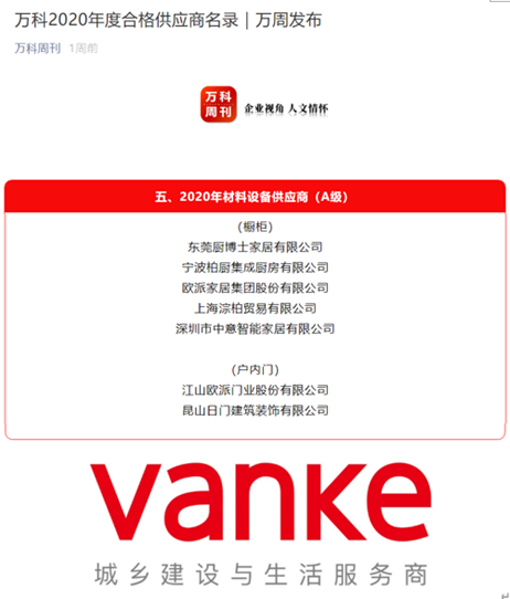 作为中国高端定制家居领导品牌,柏厨家居一直和国内外知名地产商保持着良好合作。日前万科地产通过其官方自媒体《万科周刊》发布了“2020年度合格供应商名录”,柏厨家居再次被评为材料设备类A级供应商。据悉,2020年度参评供应商共计1496家,其中仅有295家获评为“A级供应商”,每一年的评选万科都坚持客观量化的评估体系并结合供应商的线上智慧工地评估表现、第三方飞检评估成绩以及天网行动材料检测合格率和售后返修率等多维度指标开展评价,评估指标覆盖供应商全周期的业务表现,做到了可量化、可对比、可追溯。此次,柏厨家居能够再次被评为材料设备类A级供应商,既是万科对柏厨家居的认可,更是柏厨家居综合实力的展现。
