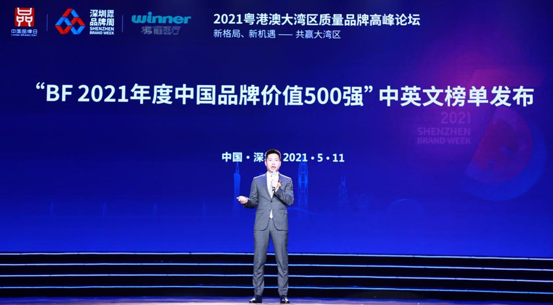 以“新格局、新机遇——共赢大湾区”为主题,由深圳工业总会、粤港澳大湾区质量发展联盟、Brand Finance中国公司、《中国名牌》杂志、央视《大国品牌》、深圳市企业品牌建设促进会联合主办,稳健医疗公司冠名的2021粤港澳大湾区质量品牌高峰论坛上,每年在达沃斯世界经济论坛发布全球品牌价值500强的国际著名品牌价值评估咨询机构Brand Finance连续第三年联合深圳工业总会独家发布“中国品牌价值500强”中英文榜单。Brand Finance中国区联合创始人、总裁陈忆登对榜单内容进行深入解读。