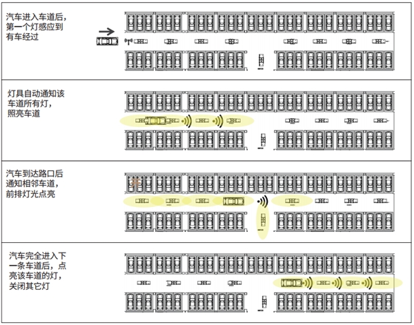1)汽车进入车道后,第一个灯感应到有车经过,灯具会自动通知该车道所有灯照亮车道;