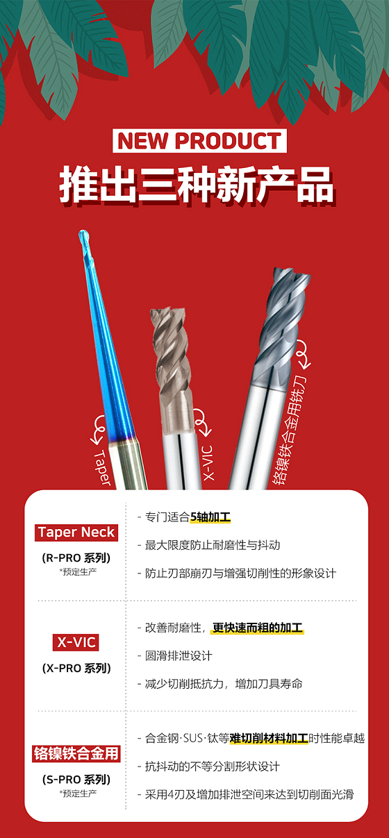 韩松将预计推出多款新型铣刀包括专门适合五轴加工、增强切削性的Taper Neck锥形铣刀;适用需要快速而粗大的加工程序、配合圆滑排泄设计的X-VIC铣刀;以及用于合金钢、SUS、钛等物料上发挥卓越性能、采用四刃及增加排泄空间而达到切削面光滑的铬镍铁合金用铣刀等, 进一步满足各行业使用上的需要。