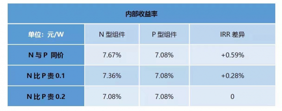 假如N型组件比P型组件价格贵0.2元/W,此时项目的IRR值为相等。