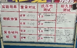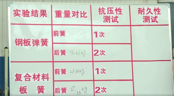 其次,承载性对比测试中,分别以2倍、2.5倍核定载荷对前板簧进行15分钟压力测试,结果复合材料板簧变形量为0,而金属板簧变形量为3mm。按照行业标准永久变形量小于4mm即为合格,但变形量越小,整车左右稳定性越好。也就是说,同条件、同时长压力下,质量更轻的复合材料板簧左右整车高度变化为0,整车左右倾斜度为0,用户全生命周期用车更安全。