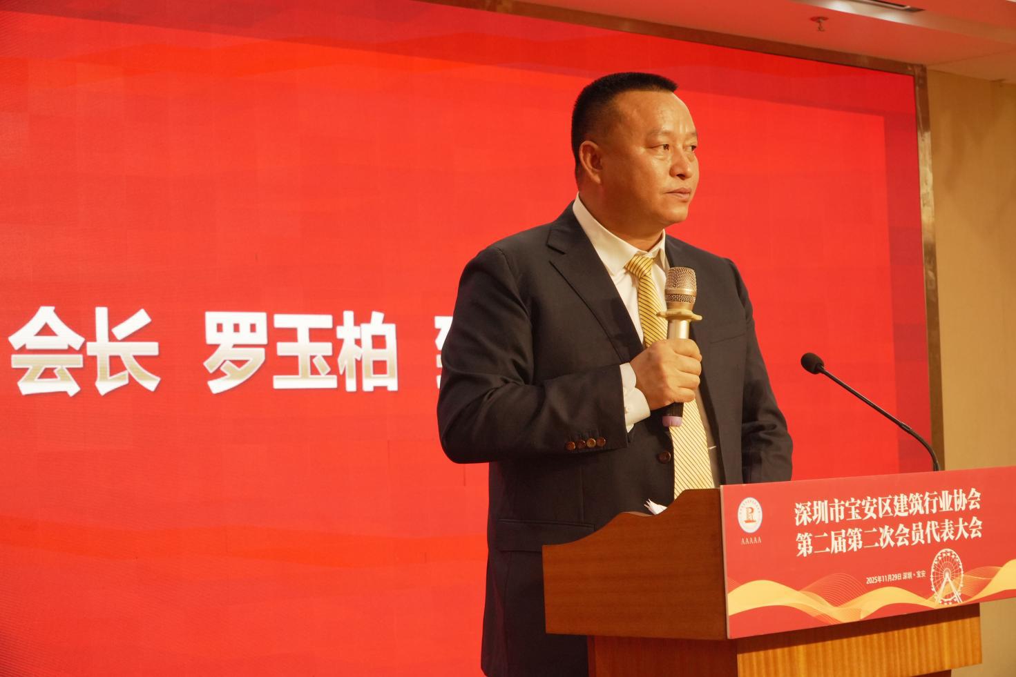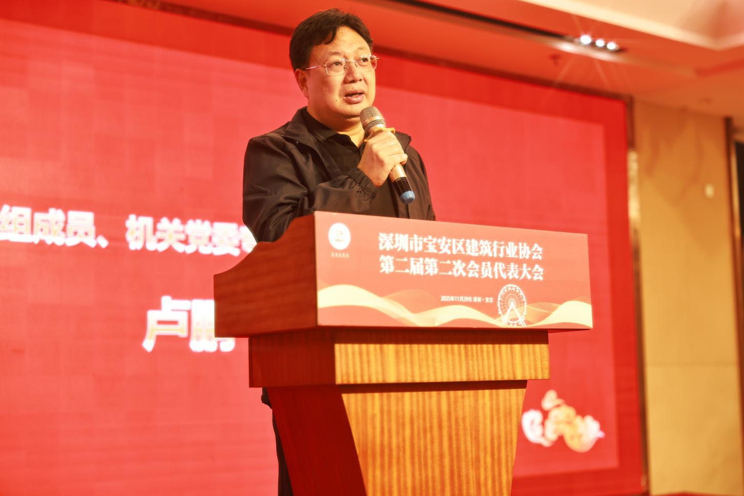 2025年11月29日,深圳市宝安区建筑行业协会第二届第二次会员代表大会在西乡街道宝悦酒店二楼多功能厅顺利召开。宝安区住房和建设局党组成员、机关党委专职副书记、纪委书记、二级调研员卢鹏飞同志,宝安区社会组织党委副书记钱东升同志及其他相关部门领导、会员代表、邀请嘉宾出席会议。
