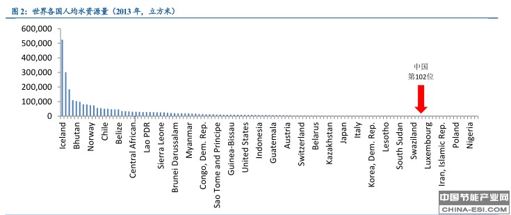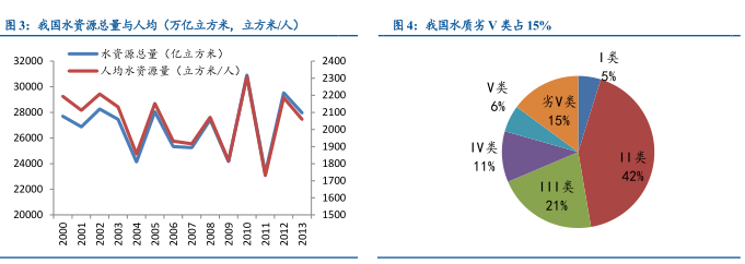 2013年我国水资源总量为2.8万亿立方米,居世界第五位,占世界总量6.5%;我国人均水资源量为2072立方米,排世界第102位,约为世界平均水平(6055立方米)的1/3,被列为世界人均水资源最贫乏的国家之一。据统计,我国2013年劣V类水占比高达15%,水资源形势严峻。